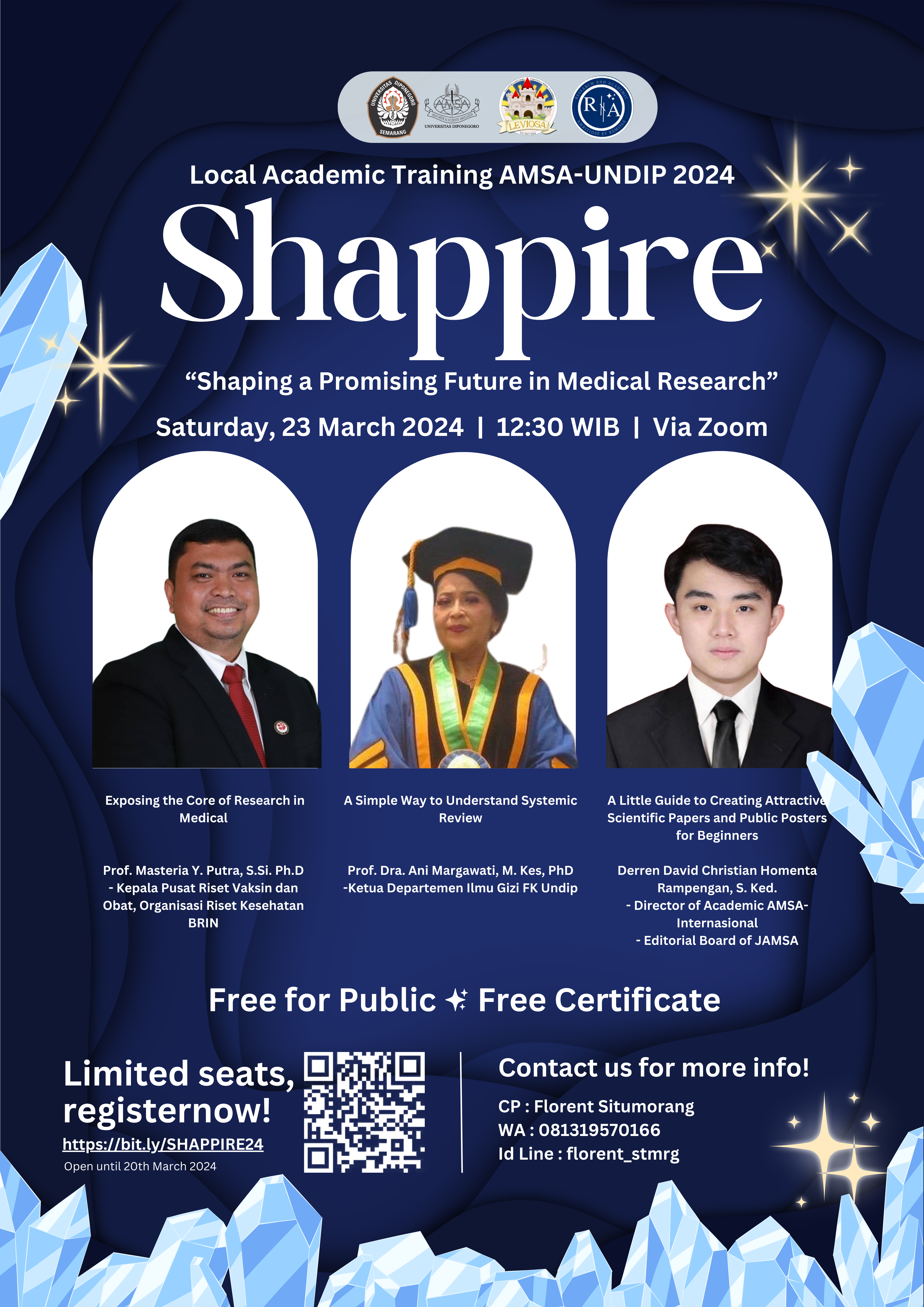 Research and Academic (RnA) is one of AMSA-Undip's internal divisions responsible for developing the knowledge, potential, and insights of AMSA-Undip members, particularly in the fields of academics and research. RnA plays a crucial role in upholding one of AMSA’s core philosophies: 'Knowledge'. To achieve this, RnA AMSA-Undip collaborates with the Academic Team and Research Team of AMSA-Indonesia.